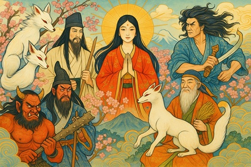 kami, o xintoísmo, o sincretismo com o budismo, e as criaturas míticas como os