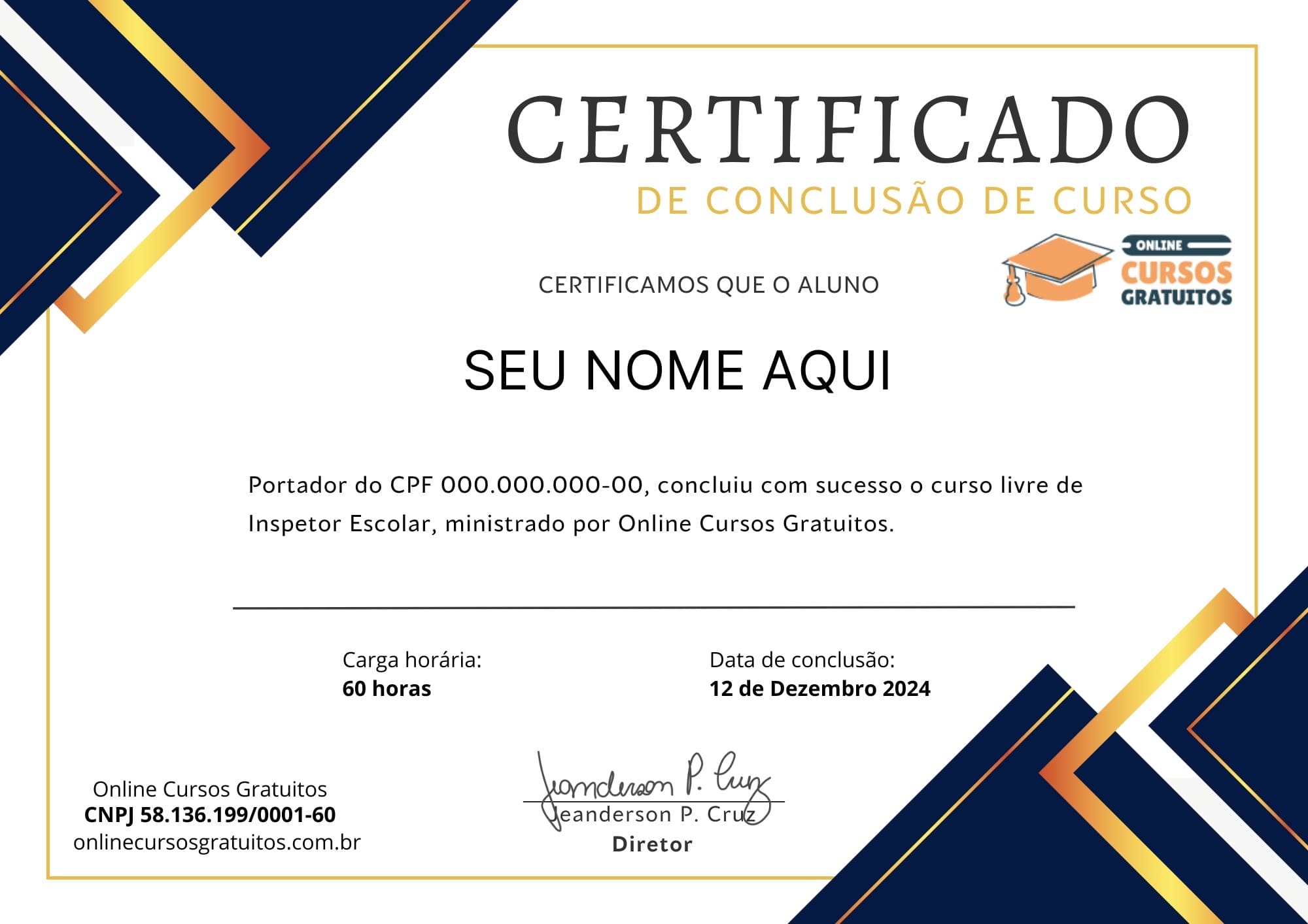Abaixo apresentamos o nosso modelo de certificado. Este é o modelo padrão para todos os cursos do site. O que muda são os dados do aluno e os do curso que ele concluiu.